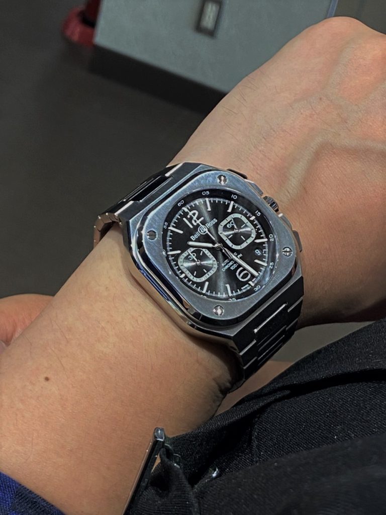 只今人気爆発継続中のBR05クロノグラフ。3針とは雰囲気も変わり、アーバンスタイルながら、より重厚さを備えた1本です。