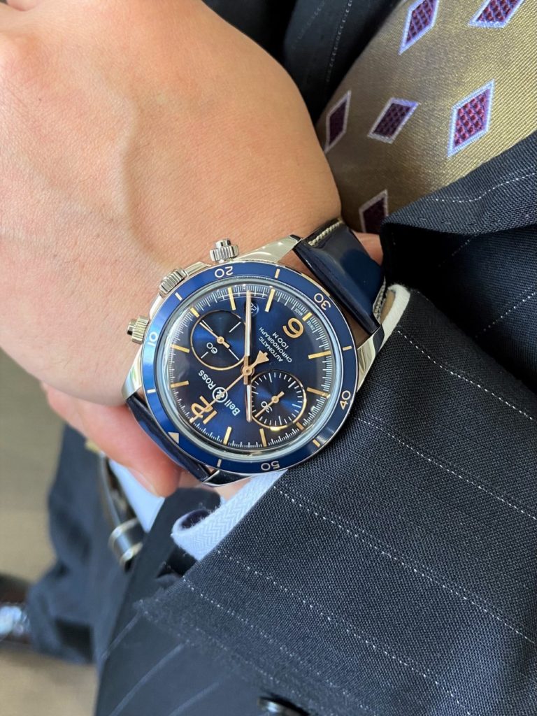 こちらはBell&Rossからフランス海軍士官の制服をモチーフにした、深いブルーとボタンや袖の飾りなどのゴールドを落とし込んだデザインの”アエロナバル”のモデルになっております。
