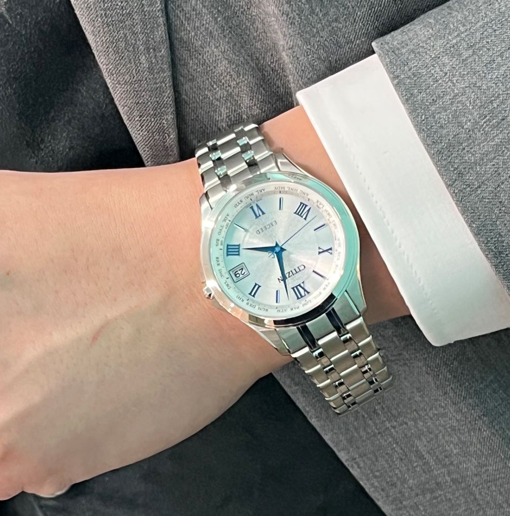 見る角度によってシルバーにも見えるホワイトの文字盤にブルーの色味が爽やかさを演出します。