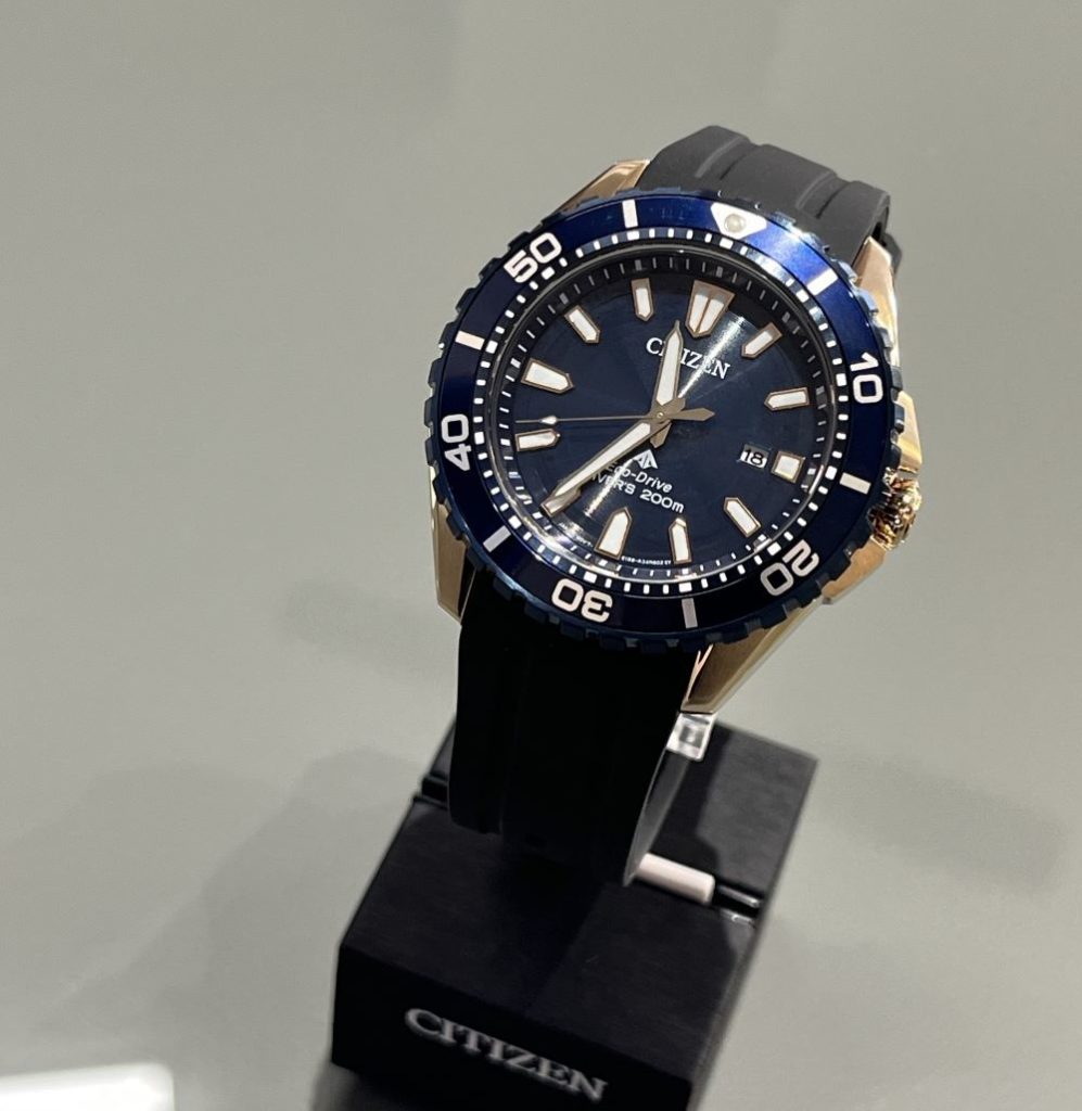 深いブルーのダイヤルとウォームゴールドのケースが印象的なダイバーウォッチになります。